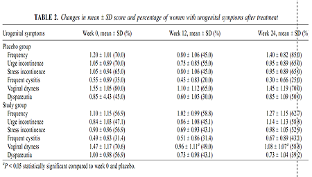Bảng thể hiện sự thay đổi về điểm số triệu chứng đường tiểu và % phụ nữ có các triệu chứng đường tiểu sau khi điều trị (triệu chứng: tiểu thường xuyên, khô âm đạo, tiểu gấp, tiểu buốt, viêm bàng quang, giao hợp đau.