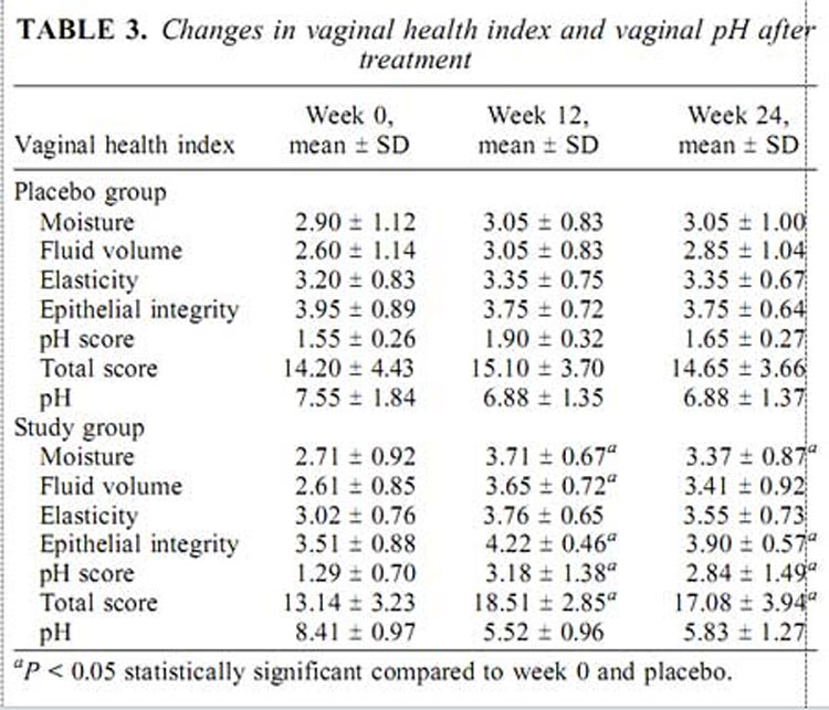 Bảng thể hiện thay đổi chỉ số sức khỏe âm đạo (độ ẩm, pH âm đạo, thể tích dịch tiết, độ đàn hồi, tính toàn vẹn tế bào biểu mô) và pH âm đạo ở cả 2 nhóm trước và sau khi điều trị: tăng đáng kể chỉ số sức khỏe âm đạo ở tuần 12 và 24 ở nhóm điều trị.